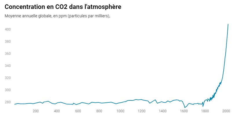 Depuis la révolution industrielle, l’intensification des activités anthropiques, et notamment la combustion des hydrocarbures, ont dérèglé le cycle du carbone. En brulant les énergies fossiles, l’Homme relâche d’un coup le carbone stocké pendant des millénaires grâce à la décomposition de la matière organique, en pétrole par exemple. Aujourd’hui, la Terre n’est plus en capacité d’absorber toutes les émissions de GES générées par l’Homme et on observe une accumulation de ces gaz dans l’atmosphère, atteignant des concentrations observées pour la dernière fois il y a près de 800 000 ans.